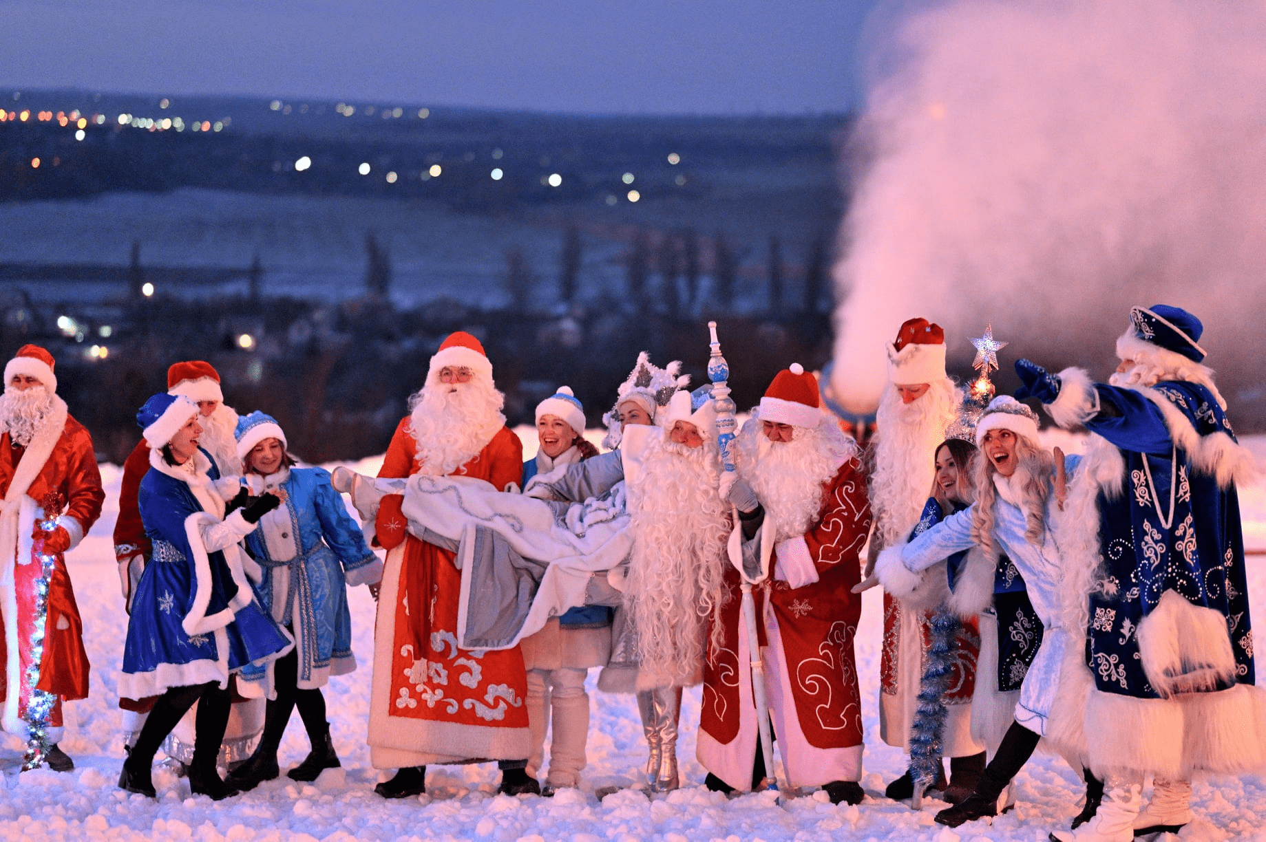 Після цього усі відправилися кататися на надувних санчатах у місцевий комплекс. А коли у місті запалили головну ялинку, вирушили розважати містян на Театральну площу. Там водили хороводи, фотографувалися і ще раз взяли участь у прямому включенні на телебаченні.